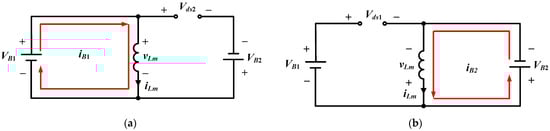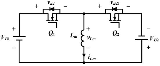 Figure 3 shows the diagram of the energy transfer path from battery VB1 to battery VB2 (assuming the SOC of VB1 is higher than VB2). VB1 stores energy in the inductor by controlling the main switch Q1 turn-on, while the inductor current increases with slope VB1/Lm, as shown in Figure 3a. The switch Q2 is driven with the complementary signal to Q1. When Q1 is turned off, Q2 is in the conduction state. Moreover, the inductor current decreases with slope VB2/Lm and releases energy to VB2 until the inductor current is zero. The diagram of the inductor releasing energy to VB2 is illustrated in Figure 3b. Vice versa, if the voltage of VB2 is higher than that of VB1, Q2 becomes the main switch and transfers the energy from VB2 to VB1.