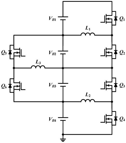 where Lm is the energy storage inductor, Q1 is the main switch, and the conventional diode is replaced with the switch Q2 as a synchronized switch. The input voltage and output voltage are substituted with batteries VB1 and VB2, respectively. This structure can be extended according to the number of batteries. By taking the number of batteries N, (N − 1) sets of bi-directional buck-boost circuits should be organized to perform the equalization process. The complete circuit diagram of four series batteries is shown in Figure 2. In this structure, the balancing current that is the average input current and average output current of the batteries could be regarded as the average current of the inductor conducted in the rising time and falling time intervals, respectively. In order to improve the balance efficiency, adjusting the conduction time of the main switch can effectively regulate the balancing current at the desired value to speed up the balancing process. In addition, the circuit operated in discontinuous conduction mode (DCM) enables the controller to calculate an accurate average current by integrating the area of the inductor current waveform over one switching cycle.