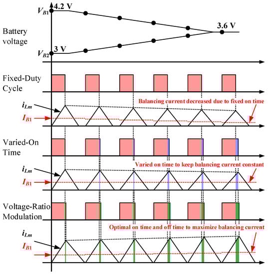 The main goals of the battery equalizer include high energy transfer efficiency, fast balancing speed, and safety in use. Moreover, the primary requirement is to achieve equilibrium rapidly. The key to the balancing speed is directly related to the balancing current. In the conventional control method, the duty cycle which means the conduction time of the main switch is constant as the buck-boost converter is used as an equalizer structure. Since the voltage of the high-SOC battery during the equalization process gradually decreases, the voltage difference between adjacent batteries becomes smaller so that the balancing current will drop if the conduction time does not change adaptively, resulting in a significant time cost in the equilibrium. Therefore, if the magnitude of the balancing current can be regulated according to the voltage of the battery, it could speed up the balance. In this circuit, the inductor current integrated over one switching period can be regarded as the average current from the battery while the main switch is turned on, so the balancing current can be controlled by changing the time interval of the conduction state. A concept diagram of the three strategies with balancing current control is shown in Figure 4, where iLm is the inductor current and IB1 is the average current of battery VB1.