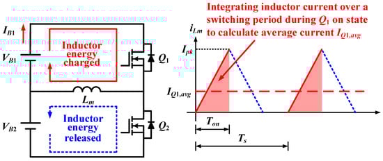 The adjacent cells can transfer energy between cells by manipulating the sequence of the switching operations of the buck-boost converter. Figure 5 shows the diagram of the circuit structure and the waveform of the inductor current when the switches Q1 and Q2 are in conduction states sequentially. The energy of the inductor is charged when switch Q1 is turn on as arrow in red color in Figure 5. While switch Q2 is turn on as arrow in blue color, the energy of the inductor is released. VB1 and VB2 are the adjacent voltages of the high-SOC battery and the low-SOC battery, respectively, Ipk is the peak value of the inductor current, IQ1,avg is the average current of main switch Q1 as well as balancing current IB1 of battery VB1, Ton is the conduction time of the main switch Q1, and TS is the switching period. The converter is operated in discontinuous conduction mode; hence, the inductor current will reduce to zero before the next switching cycle begins.