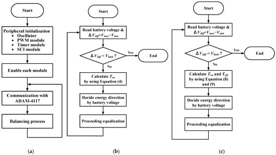 Figure 6a is the flow chart of the main control software program of the equalizer. TMS320F280049 produced by TI company is selected as a digital signal processor (DSP), and its maximum clock speed is 100 MHz. In the beginning, each required module is initialized and enabled. After entering the infinite loop, it continuously communicates with the ADAM-4117 voltage-sense module to obtain the terminal voltage information of each battery and is used in the balancing program. Figure 6b shows the flow chart of the balancing process of the VOT method. Initially, it reads the information of the battery voltage and then calculates the voltage difference ΔVdiff between the maximum battery voltage Vmax and the minimum voltage Vmin. Then, the voltage difference is used to determine whether the battery balance state is reached by comparing with the critical value Vlimit. Next, according to the aforementioned Equation (4), the conduction time is calculated in real time with the high-SOC voltage of battery condition. Furthermore, the energy flow of the converter can be controlled by the relation of the battery voltage of adjacent batteries. Figure 6c depicts the flow chart of the balancing process of the VRM method. The different portion is that when the equalizer is in the balancing process, the proportion of the conduction time and cut-off time in a switching cycle will be calculated based on Equations (8) and (9). As a result, the balancing current can be further maximized to achieve balance rapidly.