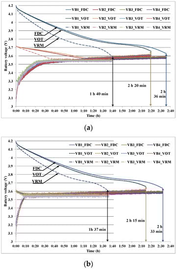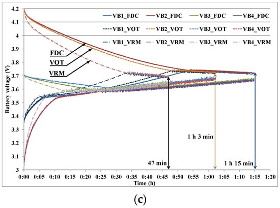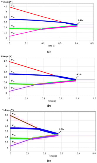 Figure 7a–c are the simulation results of the FDC method, the VOT method, and the VRM method, respectively. Figure 7a–c show that all of three control methods allow the four batteries to reach equilibrium, and the process is terminated as the voltage difference among batteries is within 50 mV. Table 3 is a comparison table of the equilibrium time of the three control methods, and the VRM method saves 31.7% and 26.3% of the time compared with the FDC method and VOT method, respectively.