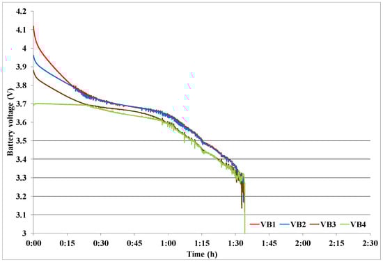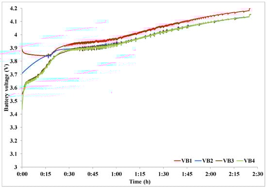 The voltage difference among batteries will significantly rise during the long-term charging or discharging process due to the influence of internal impedance, nonlinear characteristics, and temperature. If the charging or discharging process is stopped early because of unbalance, it will result in lower utilization of the battery cells. Therefore, to verify the proposed equalizer could perform the balancing process while charging and discharging, the tests were carried out during charging and discharging, respectively. Table 7 is a list of battery voltages for charging and discharging test. Each battery voltage was set lower than 4 V initially in the charging test. When the highest voltage among batteries reached 4.2 V, the charger stopped charging. The discharging test was to set the battery voltage higher than 3.6 V initially. Moreover, the charger stopped discharging when the lowest voltage among batteries dropped to 3 V. Figure 10 and Figure 11 are the battery voltage curves under charging and discharging, respectively. The experimental results show that the proposed equalizer can implement battery balancing while charging and discharging situations. The voltage difference among the batteries was within 50 mV after 30 min and the process stopped until any battery voltage reached 4.2 V or dropped to 3 V.