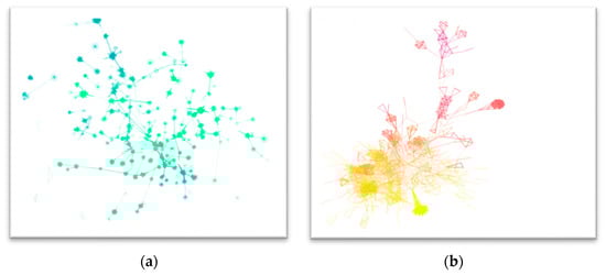 Visualized comparative analysis: (a) Network for electronic commerce field of research; (b) Network for cybersecurity field of research, designed by authors. Note: The more obvious the color, the more recent the publications.