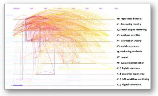 By title node, the electronic commerce research area is divided into thirteen co-citations clusters for 1559 qualified records. The timeline view illustrates the evolution of the main topics of research as follows in Figure 5. The generated data shows the most relevant topics in electronic commerce by clusters (Table 5).