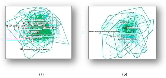 Comparative analysis by cluster mapping (keyword node): (a) clusters for cybersecurity; (b) clusters for electronic commerce.