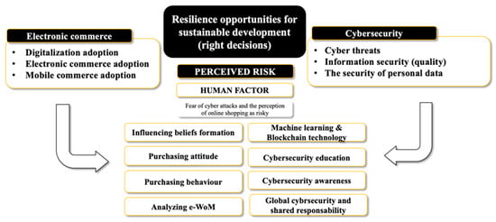 The analysis performed centred on the human factor in the middle of the pursuit of the risk faced when cybersecurity is referred to. The fear of cyber-attacks, such as ransomware or other types of cyber threats, is no longer a novel issue. What is now a real concern refers to facing the perception of online shopping as being risky, especially from the point of view of personal data security. Consumers who perceive online shopping as risky and who are concerned about the resilience of the retailer’s infrastructure and the security of the personal data [31,32] draw a connection with cybersecurity awareness, which requires the need for fraud mitigation in the online environment. The connection between cybersecurity and electronic commerce adoption asks for cybersecurity education, cyber awareness, data protection with lasting attention to purchasing behaviour, e-WOM, social commerce, and fast shipping to increase the resilience of digital businesses. A relevant outcome of this study revealed that aiding better development requires the use of data, even in the face of challenges related to global cybersecurity. Adding blockchain and machine learning alongside Artificial Intelligence [14] as technologies in use for strengthening resilience can represent the right decision for traders to accelerate the recovery to pre-COVID-19 levels. Additionally, the results of the study can complement other knowledge research fields, such as digital transformation (addressed with bibliometric analysis) [48], cyber threat and cyber-attack literature for higher education [49], but also, a global perspective on cybersecurity trends [50].