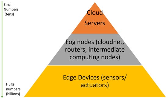 Fog computing is a distributed computing system that has been advocated to address the shortcomings of cloud computing. The system, as depicted in Figure 1, is composed of end devices, fog nodes, and cloud servers. In the lower layer, the end devices/nodes represent many tiny and cheap devices (ranging into the billions) responsible for sensing and actuating. Fog devices that are in the middle layer have computation and storage resources larger than end nodes. They also connect end devices to the cloud servers. The number of end devices in this layer is a few thousand. Finally, the top layer represents the cloud servers with extensive computing and storage capabilities. They are used to run heavy data analytic algorithms.