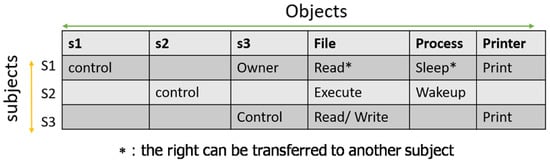 The access rights for each subject are recorded in an access control matrix. An example of a matrix is shown in Figure 3. The example shows three subjects (S1, S2, and S3) with six objects. The subjects are also called an object. The entry in each matrix describes the access rights for each subject to each object. For example, subject S1 can read the object file, use the printer, and put the process in sleep mode.