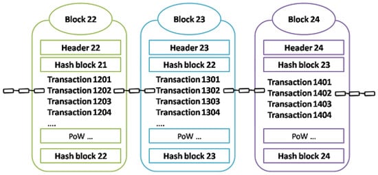 Regarding the structure of the blockchain, it encompasses three essential portions, namely: block, chain, and network. A block contains a header, hash value of the previous and current block, timestamp, and transactions (illustrated in Figure 4). The chain is used to link blocks such that each block can access all other blocks [31].