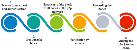 The blockchain can also be considered as a peer-to-peer network because it does not need a central entity that decides to store and manage data. For the fact that these tasks are handled by peers doing the mining, this latter is the process that permits the addition of the validated transactions in blocks (Figure 5 summarizes the steps undertaken to add a new block in the ledger). Additionally, miners are responsible for broadcasting this block to all nodes of the network.