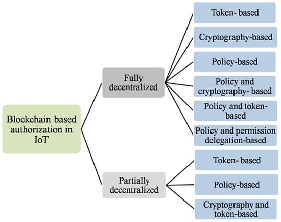 In the case where several entities participate in the specification of security policies and their evaluation, the blockchain-based authorization can be classified as fully decentralized, otherwise, it will be considered partially decentralized. Regarding a token’s based access control, it is considered as a partially decentralized process upon condition that one entity creates the token and another entity verifies it. Eventually, a distributed key-based process is considered as a fully decentralized. Figure 7 illustrates the categories and subcategories of authorization based on blockchain technology in an IoT environment. In this sub-section, a classification is provided regarding the different related works based on two categories: fully decentralized and partially decentralized.
