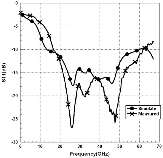 Figure 23 shows the simulated and measured S-parameters. At −10 dB, the antenna measured an |S11| operating bandwidth of 115% (16.7–61.9 GHz). At −15 dB, the |S11| operating bandwidth is 84.7% (21.3–52.6 GHz). At −20 dB, it is 17.8% (23.55–28.11 GHz) and 14.71% (42.86–49.64 GHz), respectively. The antenna will be highly efficient since it is designed without the use of active components such as diodes or transistors, and the actual S11 measurements compare favorably with the simulated results.