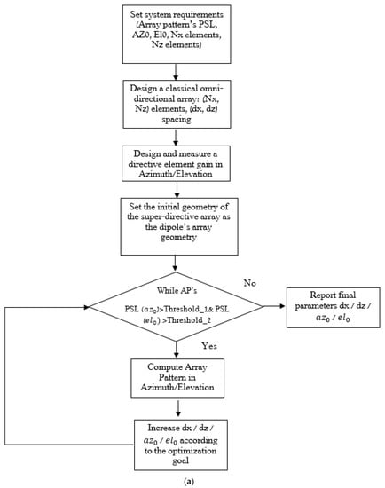 Since a restricted scan aperture is required, high antenna directivity is achievable-improving the AF directivity by increasing the element spacing and broadening the scan sector thanks to the element’s GL suppression. To find the parameters of the AF according to the desired optimization goal of the AP, we use Equation (4), where are the number of elements on the z-axis and x-axis, correspondingly, and are the element spacing defined by . While using a directional element pattern in an antenna array, we can achieve both higher systems gain and an extended scan aperture in comparison to a dipole array with the same geometry. This enhanced performance is achieved thanks to the high element directivity and the GL suppression, which allow for increases in the AF directivity by increasing element distancing. The flow chart in Figure 2a shows an algorithm for designing a super-directive array according to the system design goals. Figure 2b,c show an example of designing a directive array with a azimuth scan while meeting the design goal of a peak-to-sidelobe (PSL) larger than 10. The selection of the design working point is dependent on the optimization goal and will be detailed in Section 3.