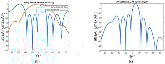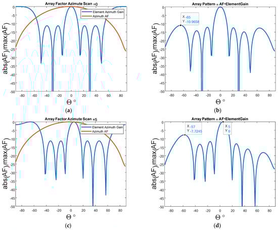 (a) Azimuth AF and Element Pattern of a dipole array without scanning; (b) Azimuth Array Pattern of a dipole array without scanning; (c) Azimuth AF and Element Pattern of a dipole array with azimuth scans of 5 degrees; (d) Azimuth Array Pattern of a Yagi–Uda array with azimuth scans of 5 degrees.