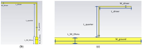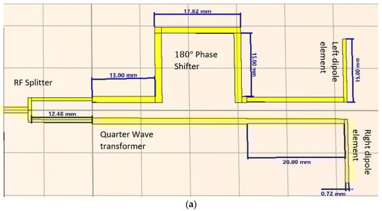 The selected element type was based on a Yagi–Uda antenna that was efficiently implemented on a microstrip PCB using an optimal balun [19] (balance–unbalance)-fed network with an antipodal antenna. This type of antenna was selected due to its high directivity, narrow band, and End-Fire radiation pattern. The antipodal implemented the dipole on two different microstrip layers: one on the top and the other on the bottom, achieving high isolation between the left and right parts of the dipole. This implementation also reduced the element size thanks to the phase shifter (PS) and splitter elimination, while also efficiently improving the element. In [20], balun implementation of a dipole with a taper ground was suggested, but it was found to be inefficient-presenting with back transmitting-and therefore, we instead the use of a superior rectangular ground.
