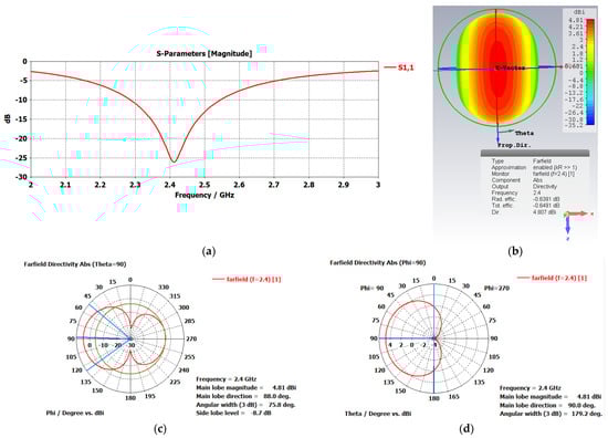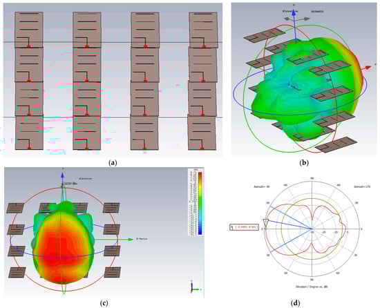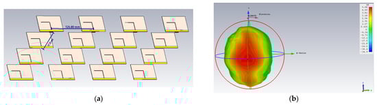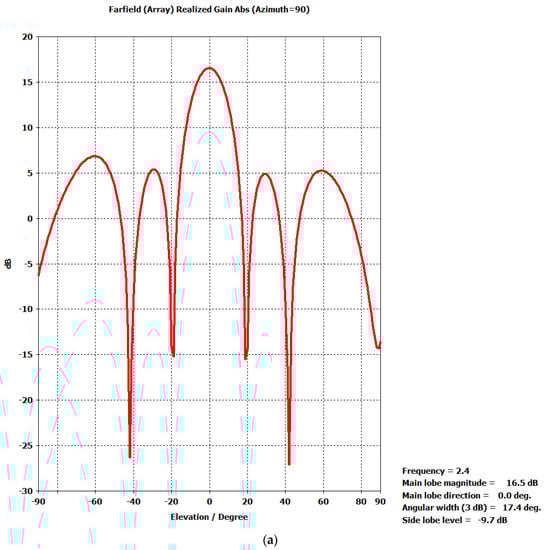 Setting the two-dimensional element spacing to and and simulating the entire Yagi–Uda array with 4 × 4 elements in CST, we obtain the results in Figure 14 and Figure 15. The results in Figure 14c show a directivity improvement in a single dipole element from ~5 dB (Figure 12b) to 8.5 dB, taking into account the coupling.