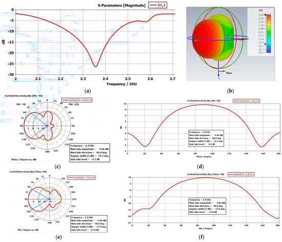 (a) Return Loss; (b) Farfield plot of the Yagi–Uda antenna; (c) Elevation Farfield directivity (polar view); (d) Elevation Farfield directivity (cartesian view); (e) Azimuth Farfield directivity (polar view); (f) Azimuth Farfield directivity (cartesian view).
