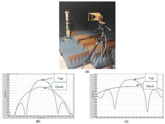(a) Farfield antenna measurement setup (b) Horizontal gain measurements of the Yagi–Uda and dipole element; (c) Elevation gain measurements of the Yagi–Uda and dipole element.