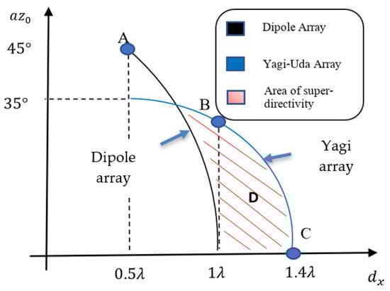 Element Array in X–Z plane; A—Dipole Array with ; B—Yagi-Uda array with ; C—Yagi-Uda array with ; D—The super-directivity domain.