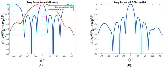 (a) Array pattern of 4 × 4 dipole elements—Azimuth’s cartesian view; (b) Array pattern of 4 × 4 dipole elements—Elevation’s cartesian view.