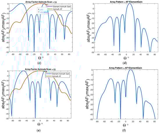 (a) Azimuth AF and Element Pattern of a Yagi–Uda array without scanning; (b) Azimuth Array Pattern of a Yagi–Uda array without scanning; (c) Azimuth AF and Element Pattern of a Yagi–Uda array with azimuth scans of 10 degrees; (d) Azimuth Array Pattern of a Yagi–Uda array with azimuth scans of 10 degrees; (e) Azimuth AF and Element Pattern of a Yagi–Uda array with azimuth scans of 15 degrees; (f) Azimuth Array Pattern of a Yagi–Uda array with azimuth scans of 15 degrees.