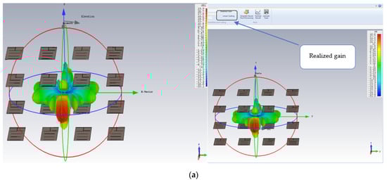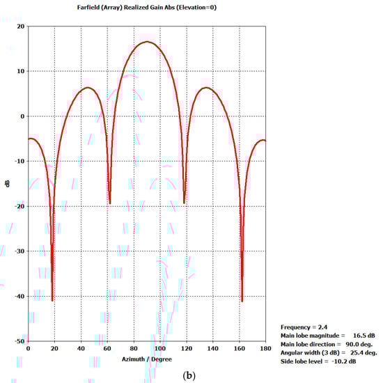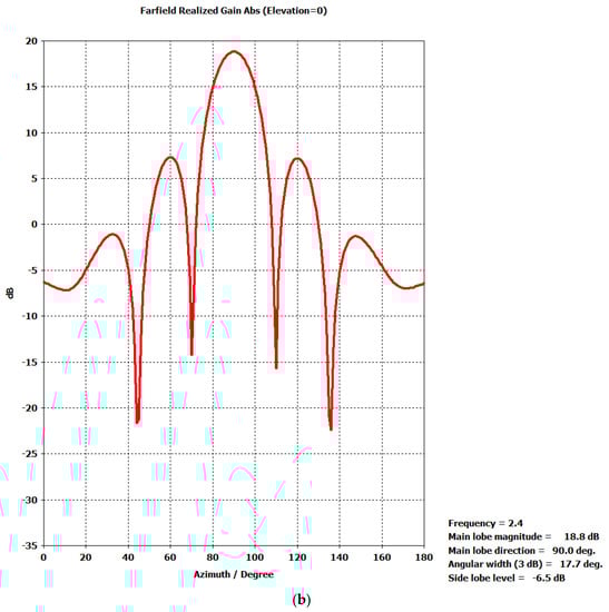 As we can see, the efficiency of the Yagi–Uda array was superior than that of the dipole array and corresponded to the results of the CST simulation, where the difference between the gain and the realized gain in Figure 15a was ~1 dB.