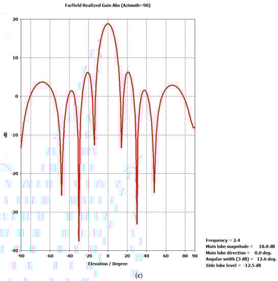 (a) Array pattern of 4 × 4 Yagi–Uda elements—3D view (Gain, Realized gain); (b) Array pattern of 4 × 4 Yagi–Uda elements—Azimuth’s cartesian view; (c) Array pattern of 4 × 4 Yagi–Uda elements—Elevation’s cartesian view.