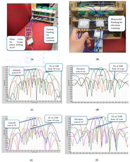 Testing the above array over several frequencies and with azimuth/elevation scans, we obtained the bandwidth and spatial gain performances of five beams for the azimuth and elevation. The scans of in the azimuth and in elevation were implemented by linear phase shifting with delay lines and the constructing architecture of the vertical and horizontal feeding networks, as displayed in Figure 17a,b. The measured results displayed in Figure 17c,d show the impossibility of scanning with the dipole due to its low PSL—whereas scanning is possible with the Yagi–Uda array, as displayed in Figure 17e,f, as it meets the requirement of , thanks to the element’s GL suppression.