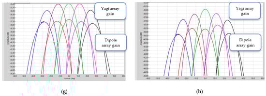 In addition, the average measured gain of the directional array scanned beams is greater by 2.5 dB than that of the dipole array, as displayed in Figure 17e,f.