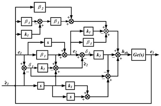Combining Equations (5) and (6), the error between the state quantity zd of LESO and the estimated quantity is defined as the estimation error , (fab is the total perturbation), and then Equations (5) and (6) are subtracted to obtain the state space expression using the estimation error e: