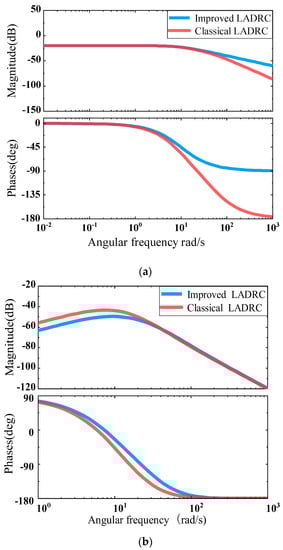 Improved LADRC tracking performance and antidisturbance porter diagram. (a) Improved LADRC and classical LADRC tracking performance Bode plot amplitude and frequency characteristics comparison analysis; (b) improved LADRC and classical LADRC anti-disturbance performance Bode plot amplitude and frequency characteristics comparison analysis.