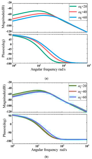 The adjustment of the parameters affected the antidisturbance control effect of the improved LADRC. It was obtained using Equation (31), and the disturbance term of the system output was related to the two parameters ω0 and ωc. The frequency characteristics when ω0 = 20 and ωc = 20, 40, or 60 were chosen, as shown in Figure 8a. Taking ωc = 20 and ω0 = 20, 40, or 60, the frequency domain characteristic curve could be obtained, as shown in Figure 8b.