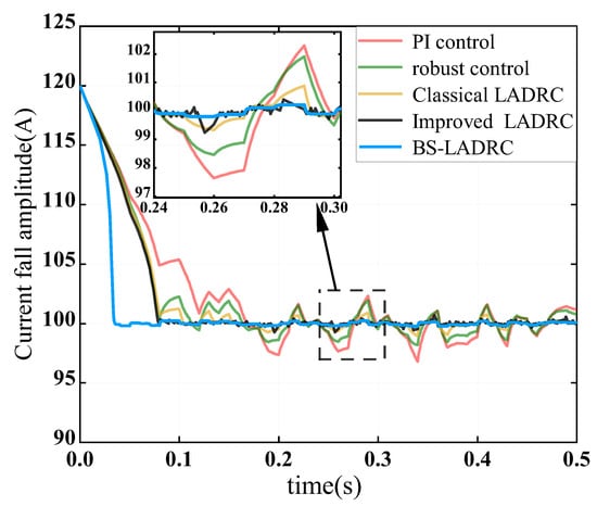 The five control strategies; namely, the double-loop PI control, the nonlinear high-gain robust control, the conventional LADRC, the improved LADRC, and the BS-LADRC proposed in the paper, were each used to compare the transient signal landing and interspersion with randomly disturbed waveforms to verify that the BS-LADRC had a better immunity when the system step signal and random disturbance runs were used as input. Figure 9 shows the antidisturbance waveform plots at the moment of random disturbance for the five control strategies. It can be seen that the disturbance fluctuated greatly in the amplitude of the double closed-loop PI control and high-gain robust control. The waveform of the conventional LADRC was relatively better. In this paper, the control effect of the LADRC with an improved control law was significantly improved, but its convergence speed effect was not better. Finally, the BS-LADRC can be seen in the figure as having the best performance. It was able to control the volatility within 1.51% of the input signal and converged quickly, with a 53.59% improvement in the convergence speed compared to the LADRC with an improved control law. Thus, it was verified that the proposed strategy had a faster convergence speed to reduce the tracking time and a better robustness and resistance to external disturbances.