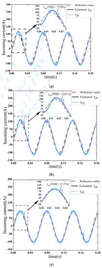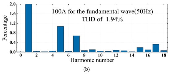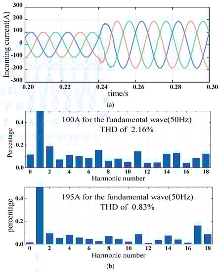 Figure 11 shows the waveform of grid-connected initial current reference i*Md(t) from 100 A due to a sudden change in power and a sudden increase in current of 195 A and its FFT analysis. Figure 11 shows the steady-state simulation results of the three-phase grid-side currents when the current injected into the grid increased abruptly from 100 A to 195 A due to power surges. Based on the designed improved LADRC control law, the compensation value of the total disturbance was split, and the exact compensation term was found. The small value of the disturbance term of the accurate compensation term E avoided overcompensation in the case of sudden changes in current, and eliminated the disturbance caused by sudden changes in current more accurately and quickly. The simulation tests clearly showed that even under severely abrupt grid conditions, high-quality grid-side currents were maintained with a THD value of 0.83%, which was in line with the specified distortion rate size for grid integration. The current responses reached a steady state after about 0.5 grid voltage cycles. It was clear that the current quickly tracked the new reference value without overshooting. This verified the stability and the ideal transient response of the proposed control scheme. The magnitude of the harmonics was more evident in the FFT results, as shown in Figure 11b, where it can be seen that the current controller did a good job of rejecting the distorted harmonics from the grid. This showed that the BS-ADRC controller limited the distorted harmonics from the grid very well, resulting in a pure output current.