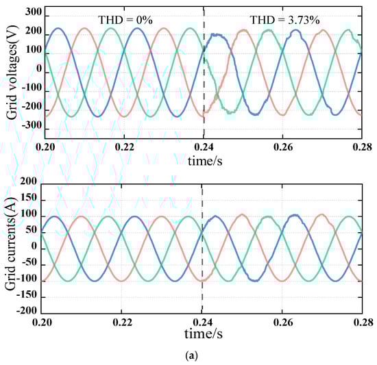 Figure 12 shows the grid voltage when suddenly jittered and mixed with 3.73% higher harmonics, its sudden change before and after the grid current i*Md(t) to suppress the harmonics, and its FFT analysis. The figure shows the simulation results of the transient grid current response with a distorted grid voltage. The BS-LADRC controlled the transient grid current response in an operating condition at 50 Hz. The moment of the initial phase at which the voltage harmonic distortion occurred showed the most severe transient response. The grid current control performance under the BS-LADRC controller is indicated in the figure. The voltage control began at 0.24 s to inject higher harmonics. The start-up algorithm obtained advance information on the best estimate of the actual grid voltage’s magnitude and phase angle. The error between the estimated and actual values was fed into the feedforward control’s backstepping control for initial preprocessing to approximate within the desired error range, and the optimized error was fed into the improved LADRC to reduce the possible misjudgment of the estimated value in the first place. The initial transient overcurrent was 106 A; however, it was quickly eliminated by the inverter damping link. In Figure 12b, it can be seen that the output iM current distortion rate of the grid-connected inverter was controlled to 1.94% compared to the grid voltage of 3.73% after the occurrence of the grid voltage jitter, which still had good power quality.