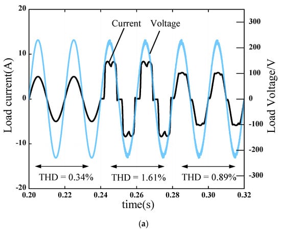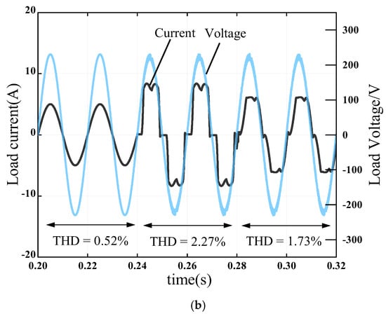 Figure 13 shows a comparison of the harmonic suppression ability of the improved BS-LADRC (Figure 13a) and the conventional LADRC strategy (Figure 13b) under different load conditions, with the a-phase load current as an example. Among them, 0.2 s to 0.24 s were pure resistive loads, 0.24 s to 0.28 s were switched to rectified nonlinear loads, and after 0.28 s were mixed resistive and rectified loads. A simulation of these load current harmonics and their THD analysis were performed. The total harmonic distortion rate of the output voltage waveform at various loads is indicated in the figure. It can be intuitively seen that the proposed BS-LADRC strategy was more capable of suppressing harmonics under mixed loads with nonlinear loads and resistive and rectified sums compared to the conventional LADRC.