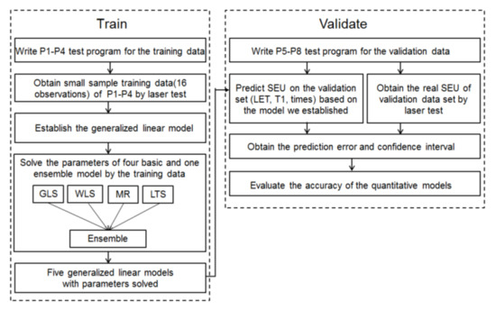12] are used to obtain the estimation parameter of the generalized linear model. The four methods mentioned above are combined with optimal weights, namely the Ensemble method as the fifth method. Then, a laser test is performed on the target circuit under the P5–P8 validation programs, and the obtained laser test data is used as the validation set to verify the generalized linear model. The flow chart of the method to quantitatively evaluate the SEE soft error cross section of complex ICs based on the generalized linear model is shown in