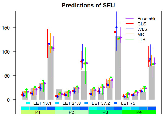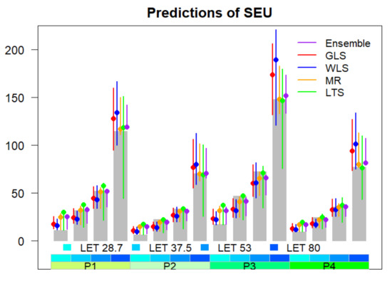 Firstly, the P1–P4 test program for the training set is written, and 16 groups of small sample test data are obtained by laser test. The test data is used as the training set for the generalized linear model. Then, GLS, WLS, MR, LTS, and Ensemble methods are established and parameters are optimized on the target functions. The P5–P8 test programs as the validation set are written and then the generalized linear model is used to predict the SEE soft error cross section. Meanwhile, the soft error cross section under radiation is obtained by laser test. By evaluating the prediction error and the confidence interval on the test data, the precision of the quantitative prediction model is obtained.