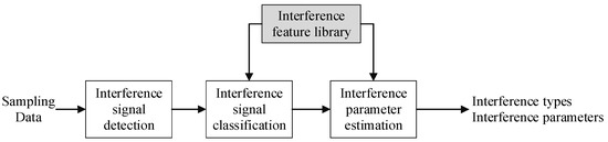 The general process of interference monitoring technology is shown in Figure 2, including interference signal existence check, interference signal classification and interference parameter estimation. Firstly, the technology detects the interference of the received sampling data to judge whether the interference signal exists [22,23]. When there are interference signals, the interference is classified and the parameters are estimated. Finally, the results of detection and recognition are output.