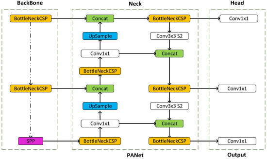 As shown in Figure 4, the network structure of this model is mainly composed of backbone network, neck network and head network. The backbone network mainly uses CSP (cross stage partial) darknet network and spatial pyramid pooling (SPP) structure, the neck network uses PANet structure, and the head network uses 1 × 1 Convolution