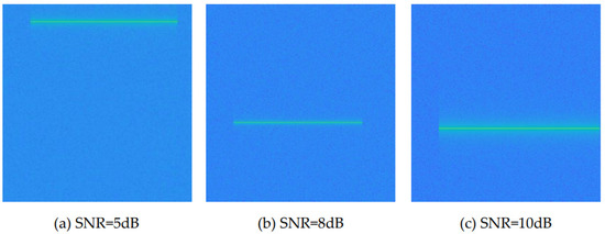 In addition, in order to make the data set close to the real scene, this scheme simulates and realizes three common channels: Gaussian channel, rice channel and Rayleigh channel according to the modeling of satellite communication channel in Section 3.1; Three different signal-to-noise ratios (SNR): 5 dB, 8 dB and 10 dB, are set to ensure the diversity of interference energy. Taking single tone interference as an example, Figure 6 shows the time–frequency diagram of single tone interference signal passing through three different channels under 10 dB signal-to-noise ratio; Figure 7 shows the time frequency diagram of single tone interference signal under three different drying ratios in Gaussian channel.