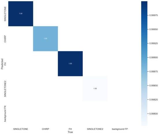 Figure 9 is a confusion matrix diagram of the classification results of four types of interference signals (single sweep and round-trip sweep are classified into the same category). It can be seen from the figure that the categories of interference signals are accurately predicted. Combined with Table 1, the accuracy and recall rate of interference signals are close to 100%.