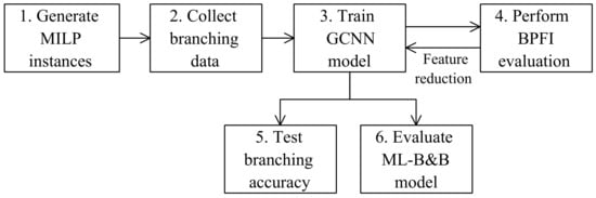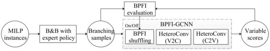 The remainder of this paper is organized as follows. In Section 2, the background and related studies of ML-B&B are discussed. In Section 3, the MILPs of four NP-hard benchmark problems are introduced. In Section 4, BPFI is evaluated for the bigraph representation, according to the results of which an improvement to the bigraph representation is proposed. In Section 5, comparative experiments are carried out to verify the effectiveness of the proposed method. Finally, Section 6 concludes the paper. The source code is available online at GitHub (https://github.com/NiuYajie0/BPFI-learn2branch, accessed on 28 May 2022).