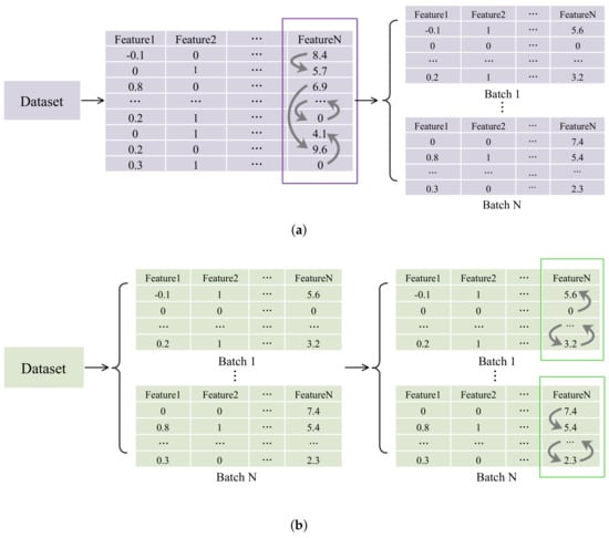 Schematic diagram of permutation feature importance evaluation and batch-wise permutation feature importance evaluation. (a) PFI evaluation. (b) BPFI evaluation.
