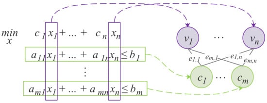 Given a MILP instance, let m be the number of constraints of which each has c features, let n be the number of variables each of which has d features, and each edge has e features. A constraint feature matrix can be used to represent the constraint nodes, a variable feature matrix for the variable nodes, and an edge feature matrix for the edges. Therefore, the original bigraph representation can be defined as , where is the set of all bigraph representations of MILPs. In the proposed problem-specific bigraph representation, the non-contributing features are masked out for each of the benchmark problems. Therefore, the proposed bigraph representation can be formulated as where , , and are the reduced features.