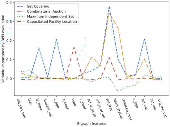 Permutation feature importance by BPFI evaluation of the bigraph features on the four MILP benchmark problems. The bigraph features are described in the supplemental file of [] and are also detailed in Table A1 in the Appendix A for completeness.