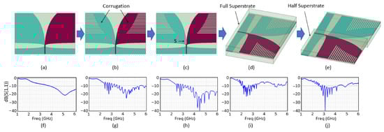- Abbosh, A. Miniaturization of planar ultrawideband antenna via corrugation. IEEE Antennas Wirel. Propag. Lett. 2008, 7, 685–688. [Google Scholar] [CrossRef]