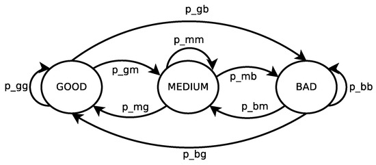 From a visual inspection of the link BER time evolution we noted that, grouping the data on a per-state basis, a link in a state i is more likely to remain in that state in the successive time slot, rather than jump to another state. Once this was verified, we decided to model the PER time evolution of a generic link as a three-state Markov chain (Figure 4), with the three states that stand for “Good”, “Medium”, and “Bad”, respectively. Specifically, if we denote as , a sequence of random variables where takes values in the set S of the three states, is the transition probability from state i to state j at step n. Additionally, by the Markov property, we have that: