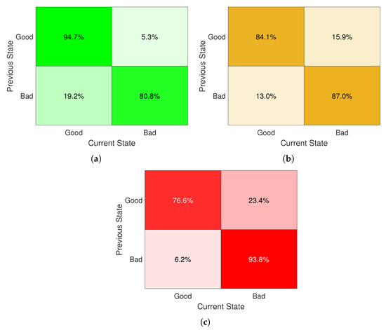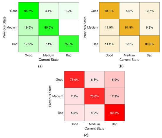 Exploiting matrix calculus, since we knew the frequencies of the BER values of each link, we found the transition matrices , which have only non-negative elements, are row-normalized to 1 and, in our case, have a size 3 × 3. In Figure 5 we show the matrix charts presenting the transition matrices for the three links discussed so far.